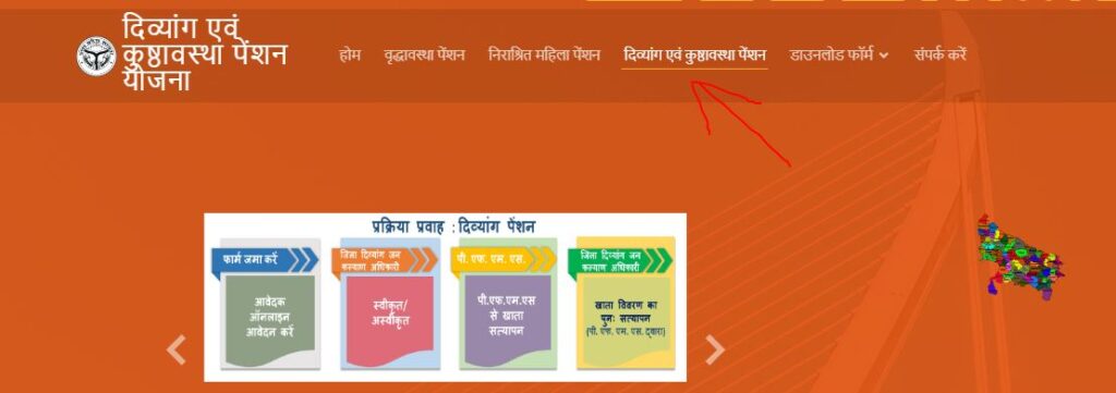 • इसके बाद मेन्यू बार में आपको दिव्यांग/ कुष्ठावस्था पेंशन से सम्बंधित लिंक पर क्लिक करना होगा.